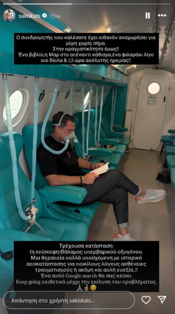 Συγκεκριμένα, έγραψε για τη θεραπεία που ακολούθησε: «Ο συνδρομητής που καλέσατε έχει πιθανόν αναχωρήσει για μέρη χωρίς σήμα. Στην πραγματικότητα όμως! Ένα βιβλίο, Μαριαλένα στο απέναντι κάθισμα, ένα φιλαράκι λίγο πιο δίπλα και 1,5 ώρα απόλυτης ηρεμίας. Τρέχουσα κατάσταση; 1η επίσκεψη: Θάλαμος υπερβαρικού οξυγόνου. Μια θεραπεία πολλά υποσχόμενη με ιστορικό αποκατάστασης για ποικίλους λόγους, ασθένειες, τραυματισμούς ή ακόμη και απλή ευεξία! Ένα απλό Google search θα σας πείσει. Keep going επιθετικά μέχρι την επίλυση του προβλήματος».