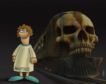 Ένα τρένο με μία νεκροκεφαλή και δίπλα ο «Μάρτης» με δάκρυα στα μάτια αποτυπώνουν την τραγωδία στα Τέμπη και αναρτήθηκε την Τετάρτη 1η Μαρτίου στα μέσα κοινωνικής δικτύωσης.