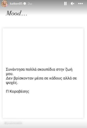 Ωστόσο, η Κατερίνα Καινούργιου επανήλθε και έκανε μια όλο νόημα ανάρτηση στο Instagram, χθες αργά το απόγευμα της Κυριακής (23/10). «Συνάντησα πολλά σκουπίδια στη ζωή μου, δεν βρισκόντουσαν μέσα σε κάδους αλλά σε ψυχές», ήταν το μήνυμα της παρουσιάστριας.