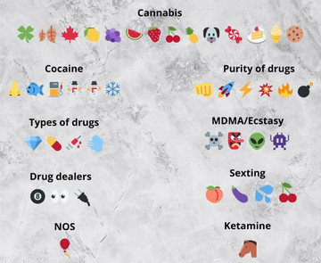 Η κοκαΐνη συχνά αναφέρεται μέσω emoji που παραπέμπουν στα διάφορα ψευδώνυμά της. Για παράδειγμα, κάποιος μπορεί να χρησιμοποιήσει μια νιφάδα χιονιού ή έναν χιονάνθρωπο για να αναφερθεί στο «χιόνι» ή ένα ψάρι. Η κάνναβη, από την άλλη πλευρά, αναφέρεται από μια εκπληκτικά μεγάλη γκάμα emoji που κυμαίνονται από σκύλους, κέικ και παγωτό έως διάφορα είδη φρούτων, όπως λεμόνια και μωβ σταφύλια. Τα πιο κοινά emoji για την κάνναβη περιλαμβάνουν επίσης ένα φύλλο σφενδάμου, ένα τετράφυλλο τριφύλλι ή δέντρα και φύλλα. Ομοίως, ένα emoji πρίζας χρησιμοποιείται για να αναφέρεται σε έναν έμπορο ναρκωτικών, ο οποίος συνήθως αναφέρεται ως «βύσμα».