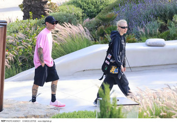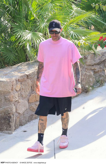 Ο Πάρης Κασιδόκωστας εμφανίστηκε casual, φορώντας ένα ροζ t-shirt, μαύρο σορτς και ασορτί sneakers, ολοκληρώνοντας το look με μαύρο καπέλο και γυαλιά ηλίου.