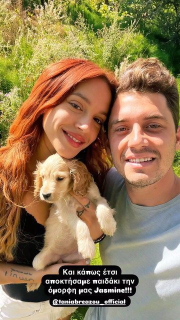 Μάλιστα, το ζευγάρι μέσα από μια τους ανάρτηση έκανε γνωστό πως οι δυο τους έκαναν ένα μεγάλο βήμα στη σχέση του, καθώς αποφάσισε να πάρει μαζί σκύλο. Η Τάνια Μπρεάζου και ο Γιώργος Αμούτζας ποζάρουν με τον τετράποδο φίλο τους, γράφοντας στα Instagram Stories τους: “Και κάπως έτσι αποκτήσαμε παιδάκι, την όμορφη μας Jasmine”.