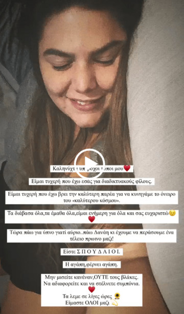 «Καληνύχτα υπέροχοι τύποι μου. Είμαι τυχερή που έχω εσάς για διαδικτυακούς φίλους. Είμαι τυχερή που έχω βρει την καλύτερη παρέα για να κυνηγάμε το όνειρο του «καλύτερου κόσμου». Τα διάβασα όλα, τα έμαθα όλα, είμαι ενήμερη για όλα και σας ευχαριστώ. Τώρα πάω για ύπνο γιατί αύριο… πάω Δανάη κι έχουμε να περάσουμε ένα τέλειο πρωινό μαζί. Είστε σπουδαίοι. Η αγάπη, φέρνει αγάπη. Μην μισείτε κανέναν, ούτε τους βλάκες. Να αδιαφορείτε και να στέλνετε συμπόνια. Τα λέμε σε λίγες ώρες. Είμαστε όλοι μαζί», έγραψε η Δανάη Μπάρκα.