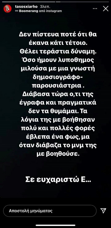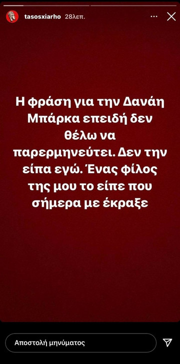 “Η φράση για τη Δανάη Μπάρκα επειδή δεν θέλω να παρερμηνευτεί. Δεν την είπα εγώ. Ένας φίλος της μου το είπε που σήμερα με έκραξε. Δεν πίστευα ποτέ ότι θα έκανα κάτι τέτοιο. Θέλει τεράστια δύναμη. Όσο ήμουν λυπόθυμος μιλούσα με μία γνωστή δημοσιογράφο-παρουσιάστρια. Διάβασα τώρα ό,τι της έγραφα πραγματικά δεν τα θυμάμαι. Τα λόγια της με βοήθησαν πολύ και πολλές φορές έβλεπα ένα φως, μα όταν διάβαζα το μήνυμά της με βοηθούσε. Σε ευχαριστώ Ε…” σημείωσε μέσα από δύο stories του.