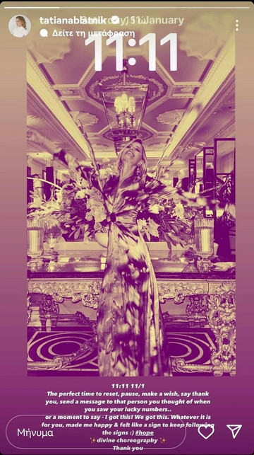 Στην ανάρτησή της, η Τατιάνα μοιράστηκε τα συναισθήματά της με τους διαδικτυακούς της φίλους: «11:11, 11/1. Είναι η ιδανική στιγμή να επανασυντονιστείς, να κάνεις μια παύση, να ευχηθείς, να πεις “ευχαριστώ”. Ή να στείλεις ένα μήνυμα σε εκείνον που σκέφτηκες τη στιγμή που είδες αυτούς τους αριθμούς. Είναι το σημάδι σου να συνεχίσεις, να εμπιστευτείς τη διαδρομή σου. Είμαι ευγνώμων. Μέσα μου, χορεύω. Ευχαριστώ».
