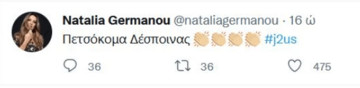 Συγκεκριμένα η Ναταλία Γερμανού δημοσίευσε στον προσωπικό της λογαριασμό στο twitter το σχόλιο “Πετσόκομα Δέσποινας” με emoji επιδοκιμασίας. Ο Θάνος Πετρέλης ακολούθως μίλησε στην κάμερα της εκπομπής “Καλύτερα Δε Γίνεται” και ρώτησε ευθέως τη Ναταλία Γερμανού γιατί υποστηρίζει τη δήλωση της Δέσποινας Βανδή, εφόσον θεωρεί άδικη την τοποθέτησή της τελευταίας.