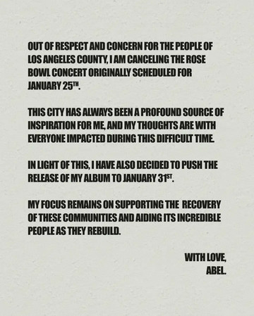 Η απόφαση αυτή λήφθηκε σε ένδειξη σεβασμού και αλληλεγγύης προς τους κατοίκους του Λος Άντζελες, όπως δήλωσε ο ίδιος ο Καναδός καλλιτέχνης στο Instagram. Συγκεκριμένα, έγραψε: «Αυτή η πόλη υπήρξε πάντα μια βαθιά πηγή έμπνευσης για μένα και οι σκέψεις μου είναι με όλους όσους πλήττονται από την κατάσταση. Η προσοχή μου παραμένει στην υποστήριξη της ανάκαμψης των κοινοτήτων και στην παροχή βοήθειας στους ανθρώπους τους, καθώς εργάζονται για την ανοικοδόμηση.»