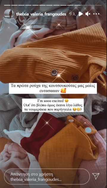 “Τα πρώτα ρούχα της κουτσουκούτας μας μόλις έφτασαν.Είμαι τόσο ενθουσιασμένη. Απ’ ότι βλέπω όμως έκανα λίγος λάθος στα νουμεράκια που παράγγειλα”
