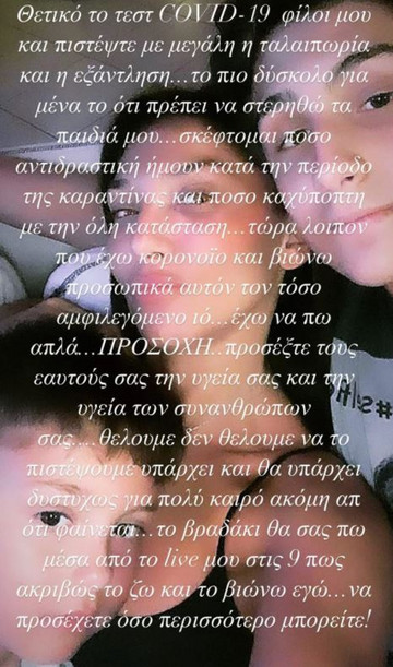 “Θετικό το τεστ Covid-19 φίλοι μου και πιστέψτε με μεγάλη η ταλαιπωρία και η εξάντληση… το πιο δύσκολο για μένα είναι ότι πρέπει να στερηθώ τα παιδιά μου. Σκέφτομαι πόσο αντιδραστική ήμουν στην περίοδο της καραντίνας και πόσο καχύποπτη με όλη την κατάσταση. Τώρα λοιπόν που έχω κορωνοϊό και βιώνω προσωπικά αυτόν τον τόσο αμφιλεγόμενο ιό… έχω να πω απλά προσοχή… προσέξτε τους εαυτούς σας, την υγεία σας και την υγεία των συνανθρώπων σας… θέλουμε δεν θέλουμε να το πιστέψουμε θα υπάρχει και θα συνεχίσει να υπάρχει δυστυχώς για πολύ καιρό ακόμη απ’ ότι φαίνεται. Να προσέχετε όσο περισσότερο μπορείτε!” γράφει ενώ ενημερώνει ότι θα κάνει live video για να πει σε όλους πώς βιώνει αυτή την ασθένεια.