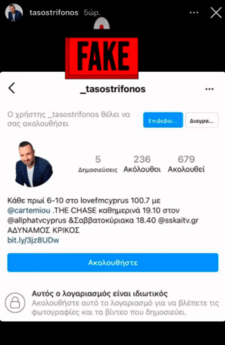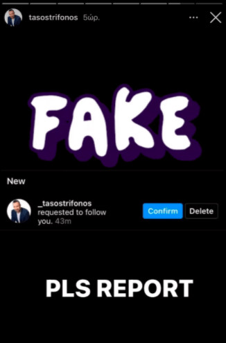 Ο Τάσος Τρύφωνος μόλις το διαπίστωσε γνωστοποίησε το γεγονός, μέσα από τα stories που δημοσίευσε και ανάφερε πώς πρόκειται για ψεύτικο λογαριασμό .
