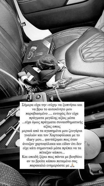 “Σήμερα είχα την “τύχη” να ξυπνήσω και να βρω το αυτοκίνητό μου παραβιασμένο. Ευτυχώς δεν είχα πράγματα μεγάλης αξίας μέσα. Είχα όμως πράγματα συναισθηματικής αξίας όπως μερικά από τα αγαπημένα μου ζευγάρια γυαλιών και τον χαρτοφύλακα με το diary μου. Φαντάζομαι πως όταν άνοιξαν τον χαρτοφύλακα και είδαν ότι δεν είχε κάτι σημαντικό μέσα πρέπει να τα πέταξαν κάπου. Και επειδή ξέρω πως πάντα με βοηθάτε αν το βρείτε κάπου πεταμένο σας παρακαλώ ενημερώστε με”
