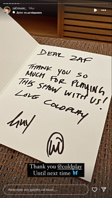 «Αγαπητέ Zaf. Ευχαριστούμε πάρα πολύ που έπαιξες στο show μαζί μας. Με αγάπη Coldplay», ήταν τα λόγια που του έγραψαν!