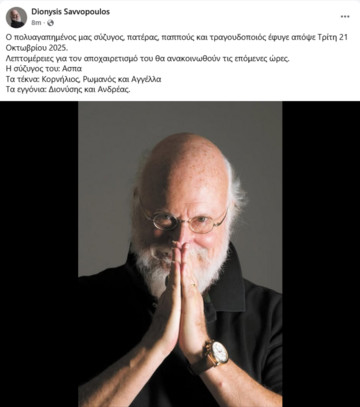 Με μια λιτή ανάρτησή της, η οικογένεια του Διονύση Σαββόπουλου -σύζυγος, παιδιά και εγγόνια- ανακοινώνει τον θάνατο του τραγουδοποιού.