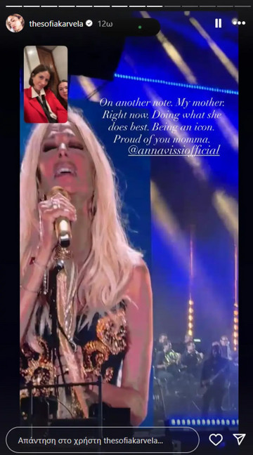 Στη συνέχεια, η Σοφία Καρβέλα δημοσίευσε σχετικό στιγμιότυπο στο Instagram δηλώνοντας πόσο περήφανη είναι για εκείνη: «Σε άλλα νέα, η μητέρα μου αυτή τη στιγμή. Κάνει αυτό που ξέρει να κάνει καλύτερα, το να είναι ένα είδωλο. Είμαι περήφανη για σένα, μαμά» έγραψε.