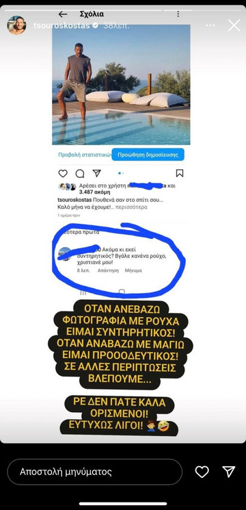 Το σχόλιο δεν πέρασε απαρατήρητο από τον Κώστα Τσουρό, ο οποίος του απάντησε σημειώνοντας σε νέο instastory: “Όταν ανεβάζω φωτογραφία με ρούχα είμαι συντηρητικός! Όταν ανεβάζω με μαγιό είμαι προοδευτικός! Σε άλλες περιπτώσεις βλέπουμε… Ρε δεν πάτε καλά ορισμένοι! ευτυχώς λίγοι!“