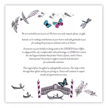 «Είμαστε ενθουσιασμένοι που θα έρθετε μαζί μας! Έχουμε ένα πρώιμο αίτημα: σας παρακαλούμε, όχι δώρα. Οι δωρεές εκ μέρους σας γίνονται στο Γραφείο της UNESCO στη Βενετία για τη διαφύλαξη της πολιτιστικής κληρονομιάς της πόλης, στην CORILA για την αποκατάσταση των ζωτικών ενδιαιτημάτων της λιμνοθάλασσας που προστατεύουν το μέλλον της Βενετίας και στο Διεθνές Πανεπιστήμιο της Βενετίας για τη στήριξη της έρευνας και της εκπαίδευσης για βιώσιμες λύσεις.