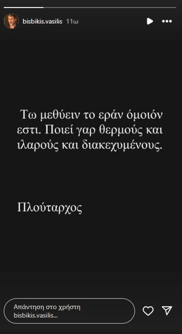 Από την πλευρά του, ο Βασίλης Μπισμπίκης ανάρτησε ένα story με ένα σοφό απόφθεγμα του Πλούταρχου, το οποίο αποδίδει τον έρωτα σε κάτι ανάλογο με το μεθύσι. Συγκεκριμένα, έγραψε: «Τω μεθύειν το εράν όμοιόν εστι. Ποιεί γαρ θερμούς και ιλαρούς και διακεχυμένους», που σημαίνει: «Ο έρωτας μοιάζει με το μεθύσι: κάνει τους ανθρώπους θερμούς, εύθυμους και διαχυτικούς».