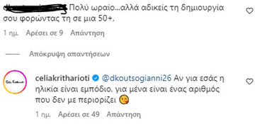 Η Σήλια Κριθαριώτη, ως δημιουργός αυτών των κουστουμιών, έδωσε τη δική της απάντηση σε μια γυναίκα που της έγραψε: «Πολύ ωραίο…αλλά αδικείς τη δημιουργία σου φορώντας τη σε μια 50+».