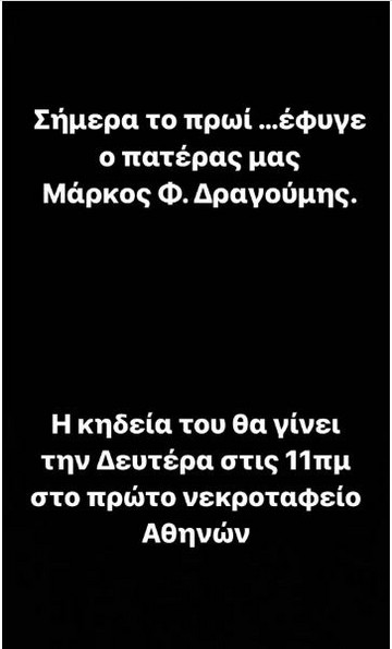 «Σήμερα το πρωί έφυγε ο πατέρας μας… Μάρκος Φ. Δραγούμης. Η κηδεία θα γίνει τη Δευτέρα στις 11 στο Α’ Νεκροταφείο Αθηνών» έγραψε η Ναταλία Δραγούμη στον προσωπικό της λογαριασμό στο Instagram.
