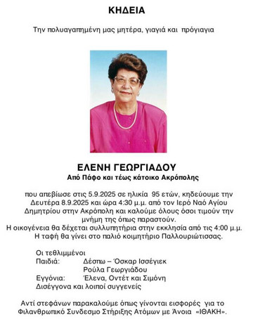 Η κηδεία της Ελένης Γεωργιάδου, η οποία καταγόταν από την Πάφο και κατοικούσε στην Ακρόπολη, θα τελεστεί τη Δευτέρα 8 Σεπτεμβρίου στις 16:30, στον Ιερό Ναό Αγίου Δημητρίου, στην Ακρόπολη. Η οικογένεια θα δέχεται συλλυπητήρια από τις 16:00, ενώ η ταφή θα πραγματοποιηθεί στο παλαιό κοιμητήριο Παλλουριώτισσας.