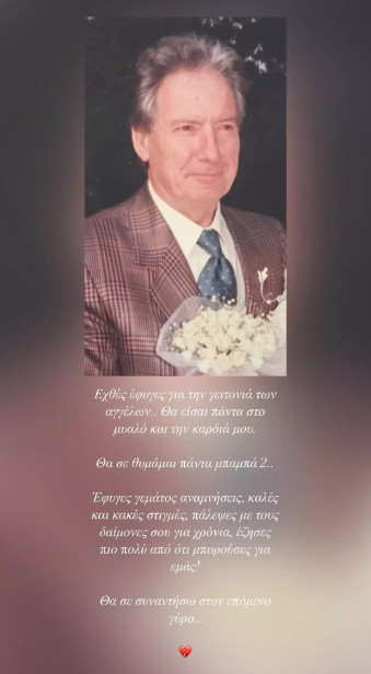 «Χθες έφυγες για τη γειτονιά των αγγέλων. Θα είσαι πάντα στο μυαλό και την καρδιά μου. Θα σε θυμάμαι πάντα μπαμπά 2… Έφυγες γεμάτος αναμνήσεις, καλές και κακές στιγμές, πάλεψες με τους δαίμονές σου για χρόνια, έζησες πιο πολύ από ότι μπορούσες για εμάς» έγραψε στην ανάρτησή του ο Κώστας Μαρτάκης.
