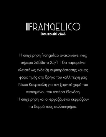 «Η επιχείρηση θα παραμείνει κλειστεί ως ένδειξη συμπαράστασης και ως φόρο τιμής στο θρήνο του καλλιτέχνη μας Νίκου Κουρκούλη για τον ξαφνικό χαμό του αγαπημένου του πατέρα, Θανάση. Η επιχείρηση και οι εργαζόμενοι εκφράζουν τα θερμά τους συλλυπητήρια» έγραφε η ανάρτηση η οποία ανέφερε το θλιβερό γεγονός», αναφέρει η ανακοίνωση.