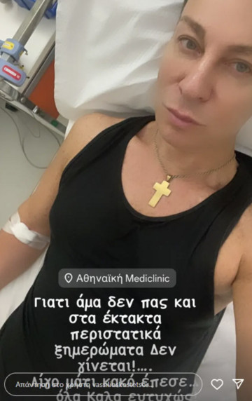 Ειδικότερα, μοιράστηκε μερικές φωτογραφίες από το κρεβάτι του νοσοκομείου και έγραψε: «Γιατί άμα δεν πας και στα έκτακτα περιστατικά ξημερώματα, δεν γίνεται. Λίγο κακό μάτι έπεσε, όλα καλά ευτυχώς. Σας ευχαριστώ για τη θετική σκέψη όλους. Η πρόληψη για την αποφυγή χειρότερων είναι σημαντική. Ό,τι ώρα κι αν είναι αυτή. Ευχαριστώ την γιατρό διανυκτέρευσης. Όλα καλά. Ευτυχώς δεν ήταν αυτό που φοβόμουν».