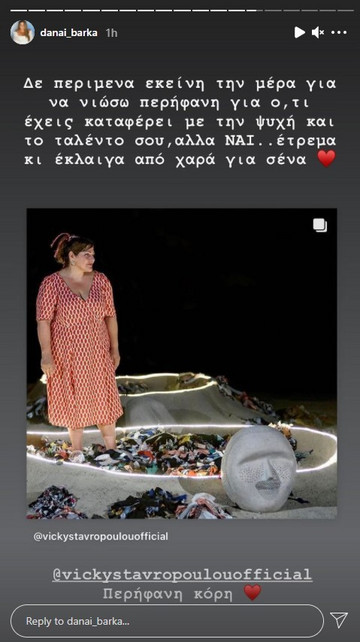 Την ανάρτηση της μητέρας της σχολίασε η Δανάη Μπάρκα, η οποία έγραψε στα stories της: «Δεν περίμενα εκείνη την ημέρα για να νιώσω περήφανη για ό,τι έχεις καταφέρει με την ψυχή και το ταλέντο σου, αλλά ΝΑΙ… έτρεμα κι έκλαιγα από χαρά για σένα».