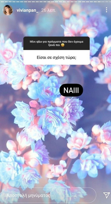 Το γεγονός αποκάλυψε με μια φωτογραφία μέσα από τον προσωπικό της λογαριασμό στο Instagram. Συγκεκριμένα, πραγματοποίησε QnA με τους διαδικτυακούς της φίλους και σε σχετική ερώτηση εάν είναι σε σχέση… η ίδια απάντησε θετικά.