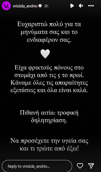 Λίγη ώρα μετά, η Βρισηίδα Ανδριώτου απάντησε με νέα ανάρτηση αναφέροντας πως έχει περάσει απ΄όλες τις απαραίτητες εξετάσεις με πιθανή αιτία την τροφική δηλητηρίαση.