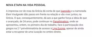 Με τις εξελίξεις να τρέχουν συνεχώς, οι Πορτογάλοι, έκαναν ένα δημοσίευμα, στο οποίο, μεταξύ άλλων, κάνουν αναφορά και στη σχέση του Φώτη Ιωαννίδη με την Ελένη Βουλγαράκη, καθώς εικάζουν ότι η σχέση του ποδοσφαιριστή με την παρουσιάστρια, μπορεί να παίξει ρόλο στην απόφαση του.