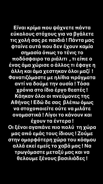«Είναι κρίμα που ψάχνετε πάντα εύκολους στόχους για να βγάλετε τη χολή σας ρε παιδιά. Πάντα μας φταίνε αυτά που δεν έχουν καμία σημασία όπως το τένις, το ποδόσφαιρο, τα ριάλιτι, τι είπε ο ένας, αν χώρισε ο άλλος, τι έφαγε η άλλη και άμα χέστηκαν όλοι μαζί. Φανατιζόμαστε με ηλίθια πράγματα αντί να δούμε την ουσία. Τόσα χρόνια στο ίδιο έργο θεατές. Κάηκαν όλοι οι πνεύμονες της Αθήνας. Εδώ δε σας βλέπω όμως να στοχοποιείτε ούτε να μιλάτε ονομαστικά. Λίγοι το κάνουν και έχουν τα έντερα. Οι ξένοι αγαπάνε πιο πολύ τη χώρα μας από εμάς τους ίδιους. Ζούμε στην ομορφότερη χώρα του κόσμου, αλλά εκεί εμείς, το χαβά μας. Να τρωγόμαστε μεταξύ μας και να θέλουμε ξένους βασιλιάδες»!
