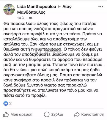 Στη συνέχεια πρόσθεσε: «Θα παρακαλέσω όλους τους φίλους του πατέρα μου και όποιον νοιάζεται πραγματικά, να κάνει αναφορά στο προφίλ αυτό για να πέσει. Πρέπει να καταλάβουμε όλοι και να αποδεχτούμε την απώλειά του. Σαν κόρη του με στενοχωρεί και με θυμώνει αυτή η συμπεριφορά. Ο πόνος δε φεύγει αλλά τον αποδεχόμαστε, μαθαίνουμε να ζούμε με αυτόν και να θυμόμαστε τα όμορφα που περάσαμε μαζί με τον μπαμπά μου. Τέτοιον πόνο δεν πίστευα ότι θα νιώσω για πολύ καιρό ακόμα και ήρθε ουρανοκατέβατο σε όλους μας. Γι’ αυτό σας παρακαλώ κάντε αναφορά σε αυτό το προφίλ, δεν πρόκειται να τον ξαναδούμε ζωντανό. Σας παρακαλώ προσπαθήστε να απαλύνετε τον πόνο μου και να πέσει αυτό το προφίλ».