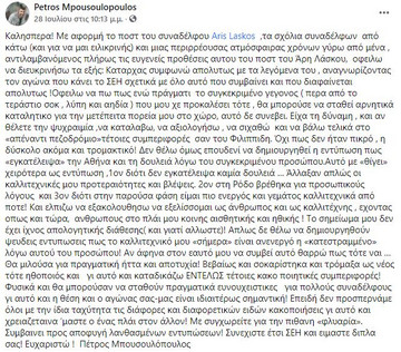 “Καλησπέρα! Με αφορμή́ το ποστ του συνάδελφου Aris Laskos, τα σχόλια συναδέλφων από κάτω (και για να μαι ειλικρινής) και μιας περιρρέουσας ατμόσφαιρας χρόνων γύρω από μένα , αντιλαμβανόμενος πλήρως τις ευγενείς προθέσεις αυτου του ποστ του Άρη Λάσκου, οφειλω να διευκρινήσω τα εξής: Καταρχας συμφωνώ απολυτως με τα λεγόμενα του , αναγνωρίζοντας τον αγώνα που κάνει το ΣΕΗ σχετικά με όλο αυτό που συμβαίνει και που διαφαίνεται απολυτως! Οφειλω να πω πως ενώ πράγματι το συγκεκριμένο γεγονος ( περα από το τεράστιο σοκ , λύπη και αηδία ) που μου χε προκαλέσει τότε , θα μπορούσε να σταθεί αρνητικά καταλητικο για την μετέπειτα πορεία μου στο χώρο, αυτό δε συνεβει.