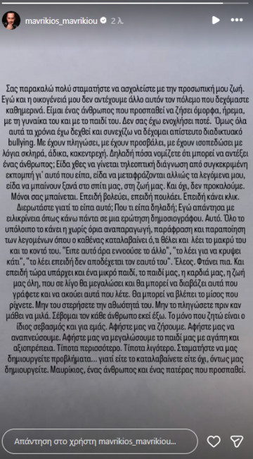«Σας παρακαλώ πολύ σταματήστε να ασχολείστε με την προσωπική μου ζωή.Εγώ και η οικογένειά μου δεν αντέχουμε άλλο αυτόν τον πόλεμο που δεχόμαστε καθημερινά. Είμαι ένας άνθρωπος που προσπαθεί να ζήσει όμορφα, ήρεμα, με τη γυναίκα του και με το παιδί του. Δεν σας έχω ενοχλήσει ποτέ. Όμως όλα αυτά τα χρόνια εχώ δεχθεί και συνεχίζω να δέχομαι απίστευτο διαδικτυακό bullying. Με έχουν πληγώσει, με έχουν προσβάλει, με έχουν ισοπεδώσει με λόγια σκληρά, άδικα, κακεντρεχή. Δηλαδή πόσα νομίζετε ότι μπορεί να αντέξει ένας άνθρωπος;