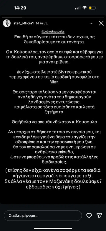 «Θα ήθελα να απευθυνθώ στον κ. Κούσουλο. Αν υπάρχει οτιδήποτε τέτοιο εν αγνοία μου, και επειδή μιλάμε για ένα θέμα που αγγίζει την αξιοπρέπεια και την προσωπική μου ζωή, θα τον παρακαλούσα να με ενημερώσει σε ανθρώπινο επίπεδο, ώστε να μπορέσω να προβώ στις κατάλληλες διαδικασίες. (Επίσης δεν είχα κανένα σοφέρ, με τα παιδιά πήγαινα στο μαγαζί και έφευγα με ταξί. Σε άλλα νέα, με τον κ. Μαζωνάκη δουλεύαμε 7 εβδομάδες και όχι 7 μήνες)», συνέχισε.