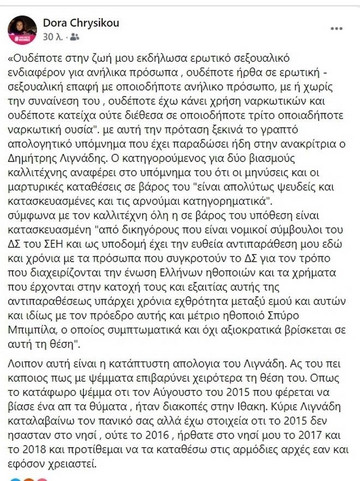 «Ας του πει κάποιος πως με ψέματα επιβαρύνει χειρότερα την θέση του. Όπως το κατάφωρο ψέμα ότι τον Αύγουστο του 2015 που φέρεται να βίασε ένα απ τα θύματα, ήταν διακοπές στην Ιθάκη. Κύριε Λιγνάδη καταλαβαίνω τον πανικό σας αλλά έχω στοιχεία ότι το 2015 δεν ήσασταν στο νησί, ούτε το 2016, ήρθατε στο νησί μου το 2017 και το 2018 και προτίθεμαι να τα καταθέσω στις αρμόδιες αρχές εάν και εφόσον χρειαστεί»