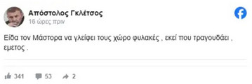 Σε ένα σκληρό μήνυμα κατά του Χρήστου Μάστορα προχώρησε ο Απόστολος Γκλέτσος μέσα από τον προσωπικό του λογαριασμό στο Facebook. Ο γνωστός ηθοποιός και πολιτικός, με αφορμή το περιστατικό του τραγουδιστή με το αλκοτέστ και όσα είπε στην κοπή της πίτας της Ένωσης Αστυνομικών Αττικής στο μαγαζί που τραγουδάει, ξέσπασε χαρακτηρίζοντας «εμετό» την συμπεριφορά του.