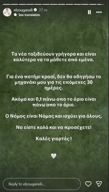 Όπως έγραψε: «Τα νέα ταξιδεύουν γρήγορα και είναι καλύτερα να τα μάθετε από εμένα. Για ένα ποτήρι κρασί, δεν θα οδηγήσω το μηχανάκι μου για τις επόμενες 30 ημέρες. Ακόμα και 0,1 πάνω από το όριο είναι πάνω από το όριο. Νόμος είναι Νόμος και ισχύει για όλους. Να είστε καλά και να προσέχετε! Καλές γιορτές!».