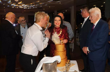Φυσικά, δεν έλειψε ο εντυπωσιακός στολισμός και μια τούρτα υπερπαραγωγή. Η Ζωζώ Σαπουντζάκη επέλεξε μια χρυσή τριώροφη τούρτα με το μονόγραμμά της, λευκά πούπουλα και χρυσά μπαλόνια.