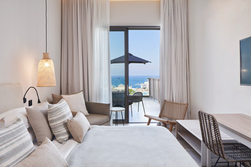 Η απλότητα, η πολυτέλεια και η ποικιλία των τύπων δωματίων βάζει τους επισκέπτες σε mood διακοπών από τη στιγμή που θα βρεθούν στο ξενοδοχείο. Δωμάτια με ή χωρίς θέα στη θάλασσα και οικογενειακές σουίτες με πισίνα, βρίσκονται ανάμεσα στις επιλογές τους.