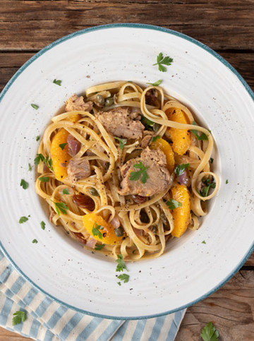Ζυμαρικά με τόνο, κάππαρη και πορτοκάλι