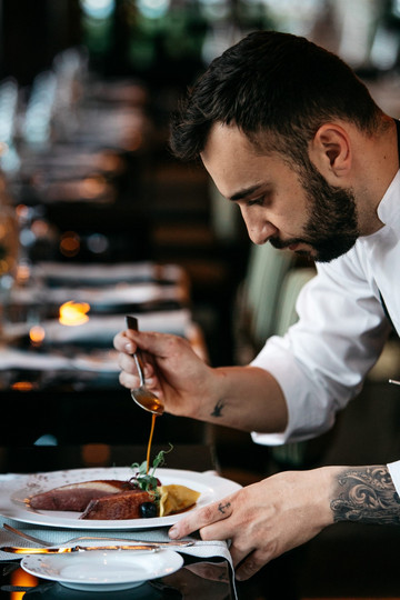 Φιλέτο πάπιας Challans με καπνιστή σάλτσα πορτοκαλιού, πουρέ πατζαριού με φυστικοβούτυρο dumplings ζυμαρικών με γλυκοπατάτα και λαχανικά