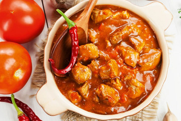 Μεταφέρουμε το κρέας στο σκεύος με τα κρεμμύδια, προσθέτουμε την ντομάτα, το σκόρδο, το δεματάκι με τα μυρωδικά, την πάπρικα και το αλάτι. Ανακατεύουμε και περιχύνουμε με τον υπόλοιπο ζωμό.