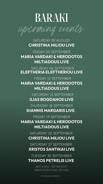 Παρασκευή 5 Σεπτεμβρίου και κάθε Παρασκευή, θα απολαμβάνουμε τον αγαπημένο μας, Ηρόδοτο Μιλτιάδους παρέα με την Μαρία Βαρδάκη. Το καλλιτεχνικό ντούο είναι έτοιμο να χαρίσει στο κοινό μια βραδιά γεμάτη ενέργεια και αγαπημένα τραγούδια ενώ στις 6 Σεπτέμβριου το Baraki υποδέχεται την Ελευθερία Ελευθερίου η οποία υπόσχεται να μαγέψει το κοινό με την φωνή και την σκηνική της παρουσία.