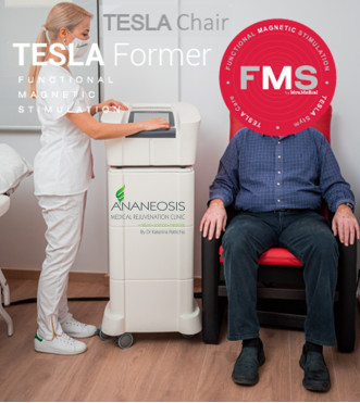 Στην κλινική μας προσφέρουμε το TeslaFormer / TeslaChair Functional Magnetic Stimulation για θεραπεία στυτικής δυσλειτουργίας σε άτομα που εμπίπτουν στα κατάλληλα περιστατικά. Αυτή η κλινικά αποδεδειγμένη θεραπεία (*) βασίζεται στο νόμο του Faraday και δημιουργεί ένα μαγνητικό πεδίο που με τη σειρά του δημιουργεί ένα ηλεκτρικό πεδίο που ενεργοποιεί το σηραγγώδες νεύρο (cavernous nerve) για να επιτευχθεί η στύση. Ενεργοποιούνται επίσης οι μύες της πυελού που συγκρατούν τα όργανα της περιοχής (π.χ. κύστη, προστάτης, ορθό) και που παίζουν ρόλο στην ούρηση, αφόδευση και σεξουαλική ζωή, καθώς και άλλα κινητικά νεύρα της περιοχής π.χ. το ραχιαίο νεύρο. Αυξάνεται επίσης η πρόσληψη οξυγόνου από τα κύτταρα και ενισχύεται η κυκλοφορία του αίματος στην περιοχή, και όλα αυτά βοηθούν περαιτέρω στην επίτευξη της στύσης. Το TeslaFormer / TeslaChair βοηθά επίσης και για θεραπεία ακράτειας ούρων τόσο στους άντρες όσο και στις γυναίκες.