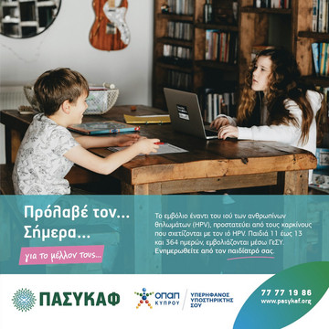 ‘Ως αποτέλεσμα της πολυετούς δράσης του ΠΑΣΥΚΑΦ μέσω του προγράμματος εξάλειψης του ιού των ανθρωπίνων θηλωμάτων (HPV), ο εμβολιασμός έναντι του HPV προσφέρεται πλέον μέσω ΓεΣΥ σε παιδιά (αγόρια και κορίτσια) ηλικίας από 11 ετών μέχρι 13 ετών και 364 ημερών.’