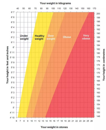 Επισήμανση: Το κίτρινο χρώμα δείχνει το ιδανικό βάρος, οι δύο αποχρώσεις πορτοκαλί χρώματος δείχνει ότι είστε υπέρβαροι,ή πολύ υπέρβαροι (στα όρια του παχύσαρκου ατόμου), το κόκκινο χρώμα ότι είστε σε επίπεδα παχυσαρκίας, ενώ το λευκό χρώμα καταδεικνύει ότι βρίσκεστε στο άλλο (επίσης ανθυγιεινό) άκρο του φάσματος και είστε λιποβαρείς.