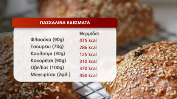 Τα εδέσματα του πασχαλινού τραπεζιού είναι πολύ πλούσια σε θερμίδες, σε λίπος αλλά και σε πρωτεΐνες. Συγκεκριμένα μόνο 90 γραμμάτια φλαούνας- ποσότητα ίση με μια παλάμη του χεριού- αντιστοιχεί σε 474 θερμίδες.