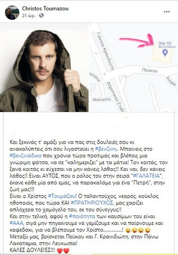 «Και ξεκινάς τ’ αμάξι για να πας στις δουλειές σου κι ανακαλύπτεις ότι σου λιγοστεύει η #βενζίνη.. Μπαίνεις στο #βενζινάδικο που χρόνια τώρα προτιμάς και βλέπεις μια γνώριμη φάτσα, να σε “καλημεριζει” με τα μάτια! Τον κοιτάς, τον ξανά κοιτάς κι εύχεσαι να μην κάνεις λάθος!! Και ναι, δεν κάνεις λάθος!! Είναι ΑΥΤΟΣ, που ο ρόλος του στην σειρά “#ΓΑΛΆΤΕΙΑ”, έκανε κάθε μία από εμάς, να παρακαλάμε για ένα “Πετρή”, στην ζωή μας!!! Είναι ο Χρίστος #Τουμάζου! Ο ταλαντούχος, νεαρός, κούκλος ηθοποιός, που τώρα ΚΑΙ #ΠΡΑΤΗΡΙΟΎΧΟΣ, μας χαρίζει απλόχερα το χαμόγελο του, εκ του σύνεγγυς!!